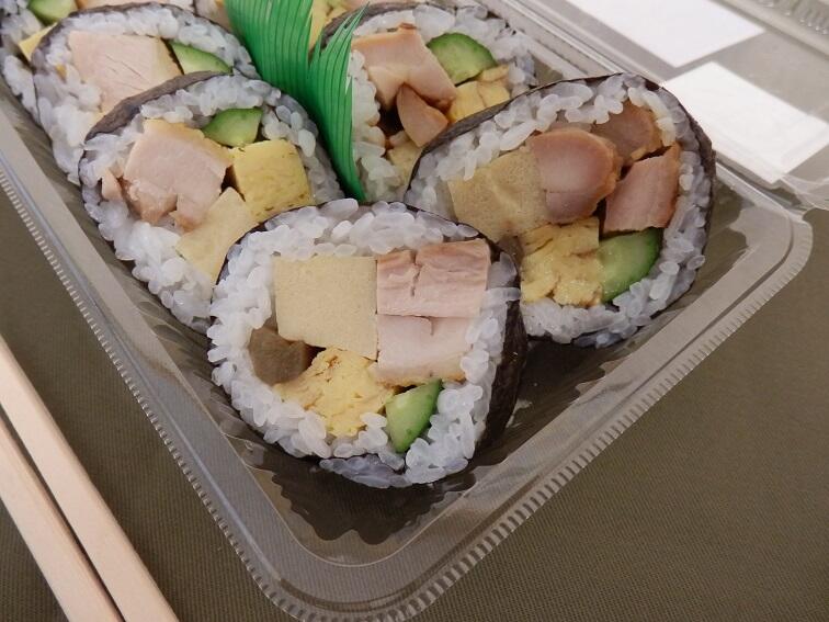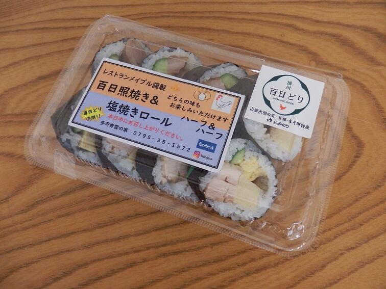 相方は、北はりまの巻き寿司では絶対外せない「厚焼き卵」のほか、高野豆腐、キュウリ、ごぼう。チキン巻きと言えば、何となくマヨネーズでサラダ巻き風?が連想されますが、そこは百日どり料理の名人メイプル(^^)。自慢の塩焼き・照り焼きの美味しさをガッツリ✨味わっていただけるよう、マヨネーズを使わない和風の繊細な味付けで仕立てました!(≧▽≦)!。